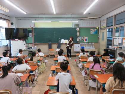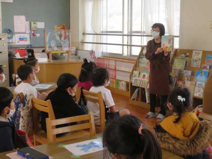 その後の図書の時間には図書館司書教諭の山下先生に「ぼうしころころ」という絵本を読んでいただきました。