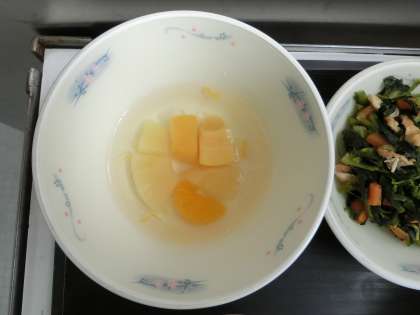 デザートはフルーツ寒天です。食器に入れ,冷めるとかたまる不思議なフルーツ寒天。4種類の果物を楽しみました。