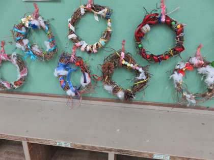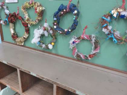 とてもかわいいリースが出来上がりました。教室の後ろにしばらく飾ってみんなで楽しみたいと思います。