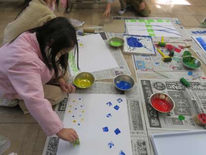 おうちから持って来ていただいた材料でスタンプを楽しみました。野菜を切ったものや,プリンやゼリーのカップ,洗濯ばさみなどいろいろなものを楽しくスタンプしました。