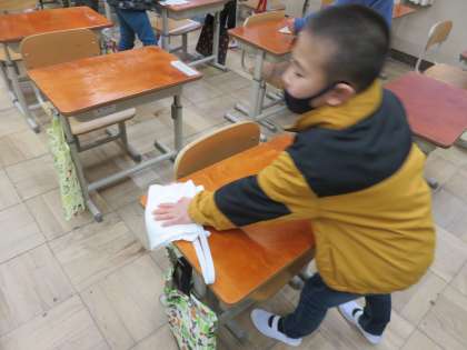 その後みんなで教室と廊下のお掃除。埃っぽかった教室がすっきりしました。