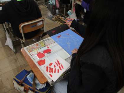 子どもたちは今,浮世絵に挑戦しています。本来ならば「絵師・彫師・摺師」の3人で版画を完成させますが,子どもたちは一人で頑張っています。自分が選んだ版画を写して,彫って,摺ってとしています。すごく細かい版画を選んだ子どもが多く,気が遠くなりそうになりながらもひたむきに向き合っています。集中を切らすことなく,頑張っています。本当に子どもたちの姿を見ると感心し,「人間できひんことはないな〜」と改めて思いました。きっと摺り終わった後の達成感はものすごいものだと思います!