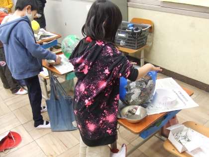ふくらませた風船に,新聞紙を貼り付けてお面の土台を作っていきます。集中して黙々と取り組む姿が見られました。