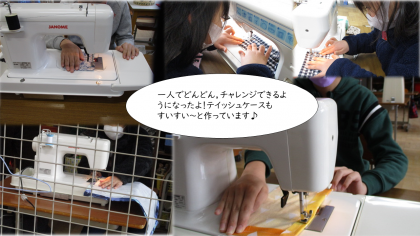 ミシンの学習では,だんだん慣れてきて一人で進めることができるようになってきました。ランチョンマットができると,もっとミシンで何か作ってみたいという意見が多かったので,はぎれ布などを使って,小物づくりに挑戦しています。テイッシュケースやコースターを作りました。