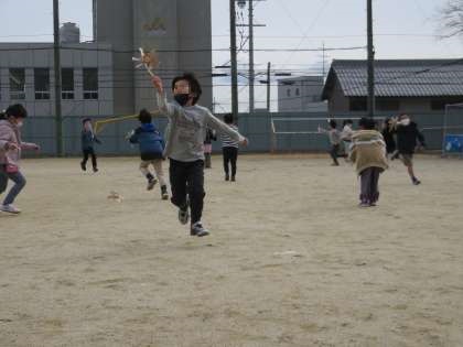 今日は「風車」紙コップを使って作った風車をもって運動場で走り回りました。寒い中でしたが,顔を真っ赤にしてみんなで楽しみました。