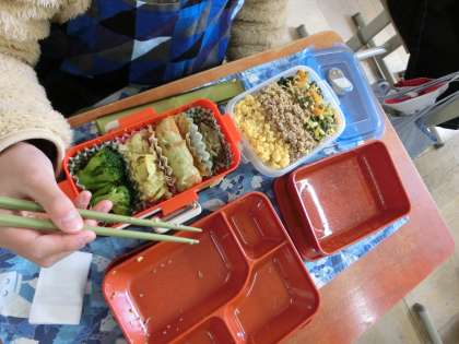 実際に自分の持ってきたお弁当箱に給食を詰めて,どれくらい入るのか試してみました。