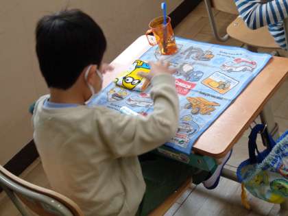 また,給食の準備はというとナフキンをひいたり,おはしをセットしたりと随分スムーズになってきました。給食も黙々がんばって食べています。