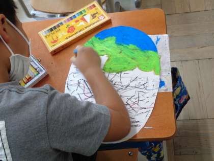 まず,今日はたまごづくりです。「たまごからどんなものが生まれるかな?」という質問に「ドラゴン!」「家!」「海!」など想像力あふれる答えが。さすが2年生ですね。そして,そんないろんなものが生まれるたまごを,パスでぬりぬり…。個性豊かなたまごが出来上がりました。次回はそんなたまごが割れる予定です。楽しみですね。