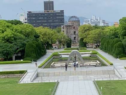 資料館の中から,慰霊碑とドームが一直線に並んだ景色が見えました。