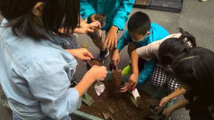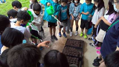 総合的な学習で,障害者支援施設である大原野の杜の方と地域の方達のご協力を得てケナフの種まきを行いました。