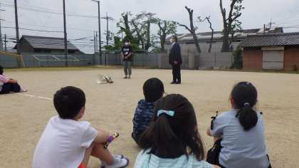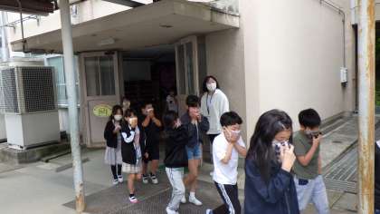 という放送の合図で,一斉に運動場へ避難しました。