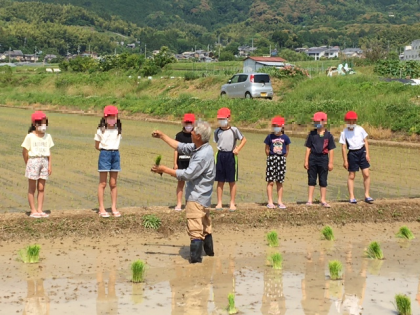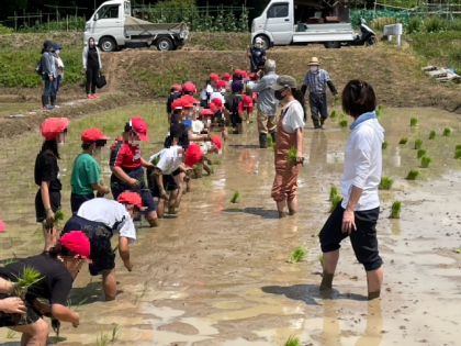 地域の方やPTA・保護者の方の協力をいただき,3年生と5年生で田植え体験をしました。お話をよく聞いて,みんな上手に田植えをすることができました。