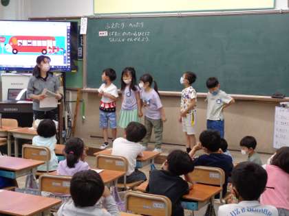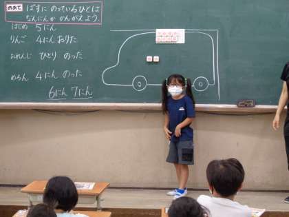 今日の算数科では,「ふえたりへったり」の学習を行いました。教壇をバスに見立てたり,数図ブロックを操作したりして,本当にその人数になるのかを確かめました。まだまだごっこ遊びが好きな1年生。楽しみながら学習に取り組んでいました。