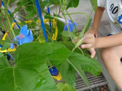気温の上昇に伴い、あさがおがもたくさんの花が咲いてきました。蔓も支柱を軽く超えるぐらいのビッグな草丈に、色とりどりの花が咲き乱れます。子どもたちの顔もあさがおのように、ニコニコです。