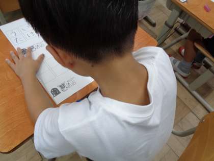 1年生では硬筆書写作品展に向けて見本を見ながら、
