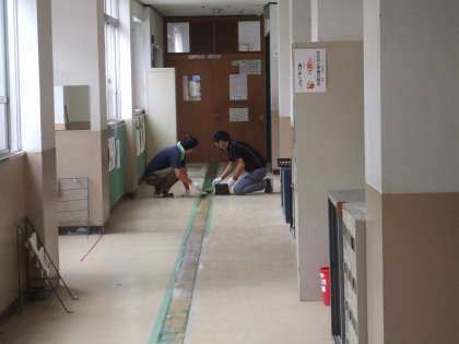 8月21日(日)、「大原野小学校おやじの会」の皆さんに学校内の廊下や階段のペンキ塗りをしていただきました。子どもたちが、校舎や渡り廊下を安全に通行できるようにと消えかかっていた中央線をきれいに塗り直してくださいました。塗り直し箇所はたくさんあったのですが、分担して手際よく塗ってくださったので、予定よりも早く仕上げることができました。
