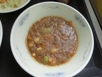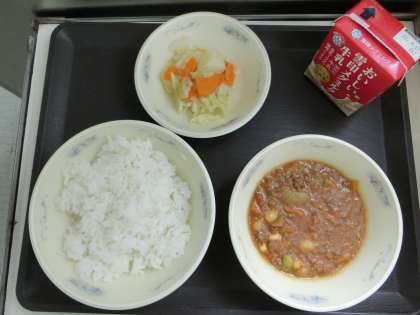 給食のキーマカレーは、いろいろな豆が隠れています。金時豆・枝豆・大豆・手ぼう豆・・・、苦手な子もこれなら食べられるようです。