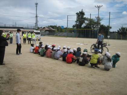 運動場に出て、いよいよ実技の開始です。交通安全推進委員会の方々も見守ってくれています。