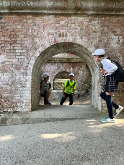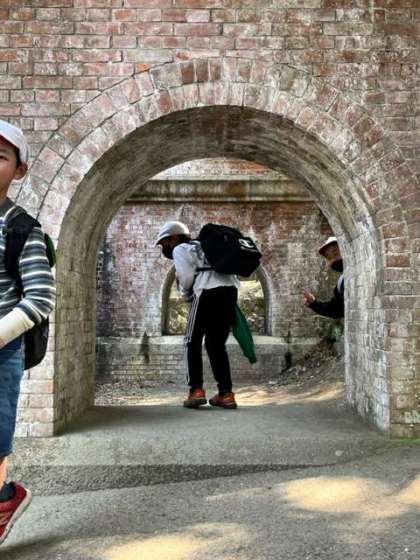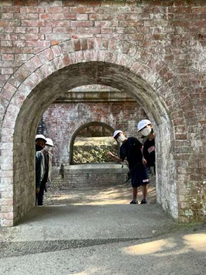 水路閣に行きました。見えてくるなり、「すごい!」「きれい!」と感動している声がたくさん聞こえました。なぜ上に琵琶湖疏水を流さないといけなかったか思い出しながら、たくさん写真を撮りました。