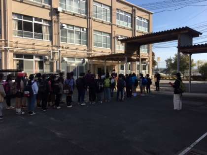 いい天気で良かったです。出発式を終え、子ども達はバスに乗って大阪・万博公園に向かいました。