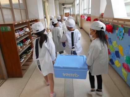 給食当番3回目の1年生!ふたりで協力して運びます。