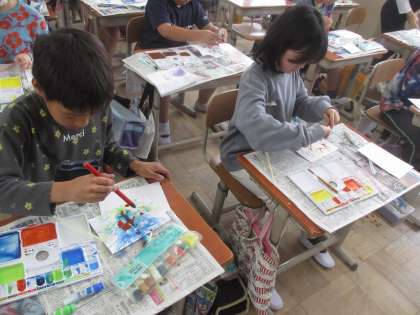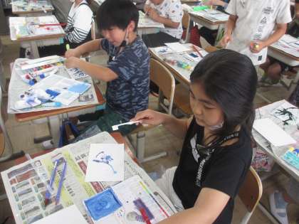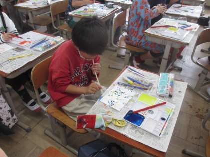 図画工作科「絵の具でゆめもよう」の学習で、ドリッピング、スパッタリング、デカルコマニーという技法に挑戦しました!!「うわぁ、先生、チョウのような模様ができたよ。」「見て見て!すごくきれい!!」とおどろきと、喜びの声に包まれていました。