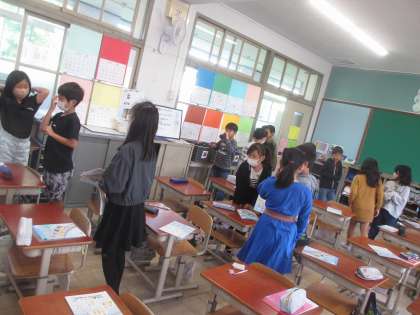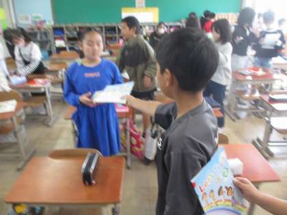 授業の切り替え時間、すぐにトイレに行き、仲間のために、次に使う教科書を配る姿がキラリ。自分で考えて動く、『自考動』がどんどんみんなに伝わっています。