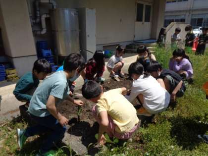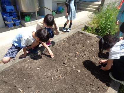 先週、ホウセンカとヒマワリのたねの観察をした後、畑にまきました。「もう、芽が出てた!」と毎朝、成長を楽しみに見に行っている子どもたちもいます。