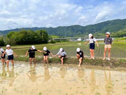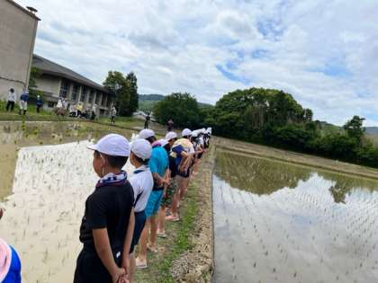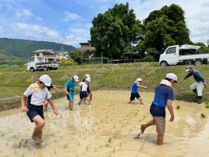 地域の方や保護者の方にご協力いただき田植え体験をしました。子ども達は田んぼに裸足で入ると聞いてびっくり!なかなか入るのをためらっていましたが、一度入るとなれない足の感触に戸惑いながらも歩みを進めていました。