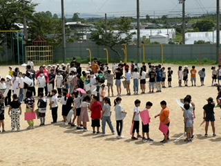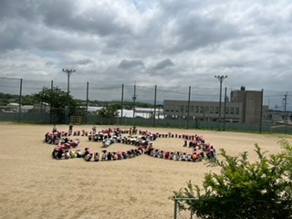 全校児童と全教職員が運動場に出て人文字で校章を作りました。