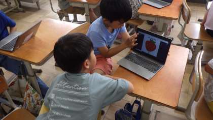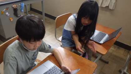 GIGA端末で作ったオリジナルクイズを見せながら、