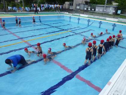 本日は低水位での学習でしたが、水かけをしたり、わにやひよこになったりして歩いたりと、にこにこいっぱいの笑顔で学習に取り組んでいました。