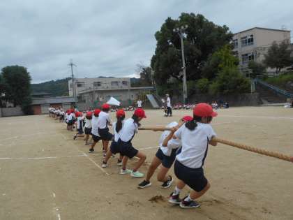 1年生から6年生までが、力と心を一つに1本の綱を引きあいます。腰をしっかり落としてへそを空に向けて。今日のところは2回戦とも赤が勝ちました。さてさて本番は。メラメラ闘志がわいてきました。