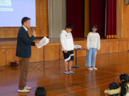 11月の朝会では、部活動交流会相撲の部で優秀な成績を収めた6年生に表彰状の授与がされました。