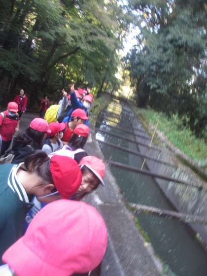 作ったひとは、田辺さくろうさん。上に流れている疏水を見て、さらに感動していた子ども達です!!