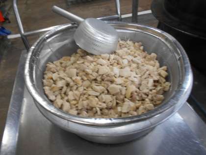 鶏肉のあまから煮は、鶏肉を炒めた後に、一度ザルにあげ、余分なきってからたまねぎと炒めています。