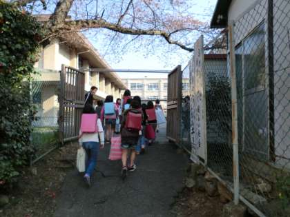 新1年生も集団登校で学校に来ました。少し荷物が重たそうでしたが,元気にみんな登校しました。声かけ運動にご参加いただいたPTAの皆様,ありがとうございました。