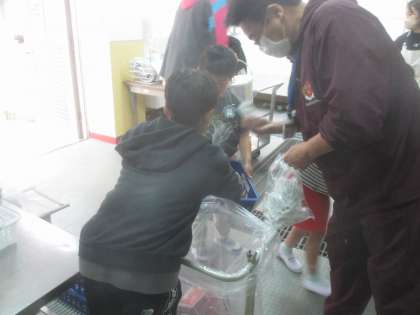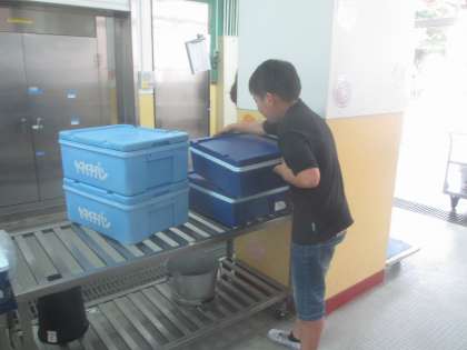 給食委員会の仲間です。早く食べ終わり、給食室で食管を返却するところでお手伝いをしてくれています。真っすぐそろえたり、牛乳パックの返し方を教えたり、下級生を手伝ったり…、責任をもって動く姿がかっこいいです。