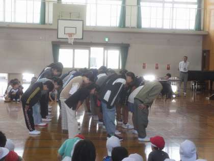 6年生は、休み時間の過ごし方について教えてくれました。6年生から、休み時間に使うことができるボールを受け取ると、一年生はとてもうれしい様子で「ありがとう。」と伝えていました。「翼をください」を歌う6年生の歌声がとてもきれいで、1年生は真剣に聞いていました。「礼」も全員そろっていて最高!!さすが大原野小の最高学年です!!