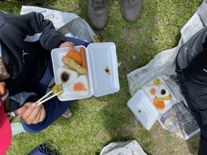 滝ハイクを終えた後は近くの親水広場で好天の下、お弁当を食べました。
