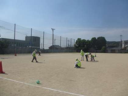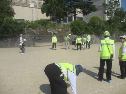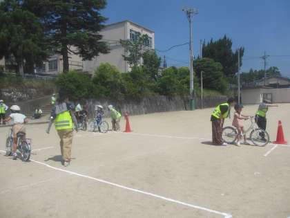 朝早くから、運動場に線を引いたり、コーンを置いたり…と、地域の方とPTAの方が準備をしてくださいました。運動場にできた道路!!自転車教室に向けて準備万端です。