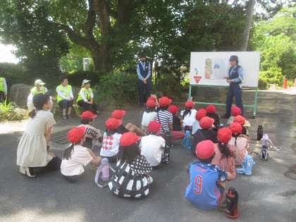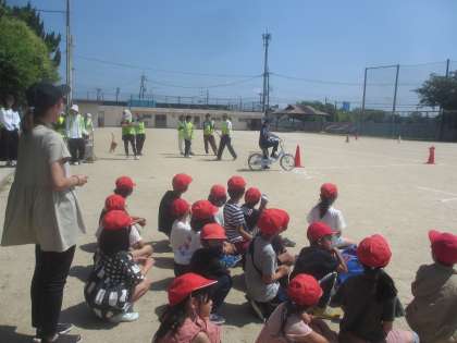 西京警察署の方のお話をしっかりと聞く2年生。自転車に安全に乗るためのルールをとてもわかりやすく教えてもらい、心の準備が整いました。「がんばるぞ!」の気持ちが素敵!!