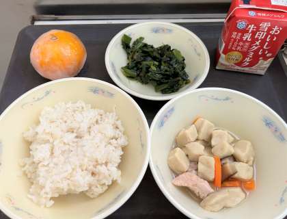 麦ごはん 牛乳 高野どうふと野菜のたき合わせ ほうれん草のおかか煮 みかん でした。