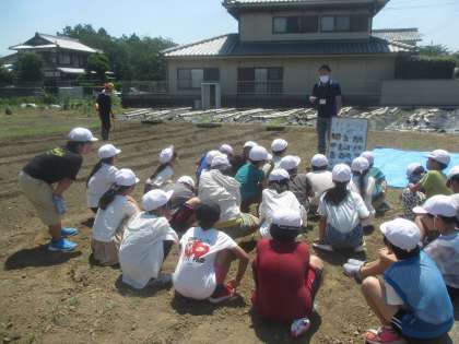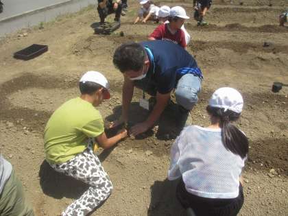 大原野の杜の方との交流で、芽から育った「ケナフの苗」を畑に植え替えました。