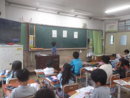 自分が作った漢字カードを使って、クラスのみんなに書き順や画数、読み方を教えています。ミニ先生になって、教える姿、友達のお話を聞いて学ぶ姿、3年生は教え合いがとっても上手です!!