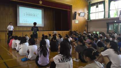 1学期をふり返り、頑張ったこと、さらに頑張りたいことを自分自身で考えることができた子ども達。その思いをみんなに伝える様子は、ちょっぴり恥ずかしそうだけど、自信に満ちたいい顔をしていました。最後に、安全主任の先生が、夏休みの過ごし方についてお話すると、良い姿勢でしっかりと聞いていました!聴く姿勢が素敵です!!