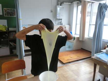 たけのこ学級では、目標を設定して達成できた際にお楽しみの活動に取り組んでいます。今回は「もこもこスライム作り」に挑戦しました。合成のり・水・ほうしゃ水溶液にシェービングクリームを混ぜることでいつもよりもこもこのスライムが出来上がり、子どもたちは感触を楽しんだり見せ合ったりして楽しんでいました。