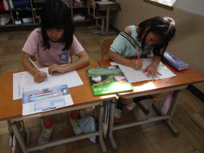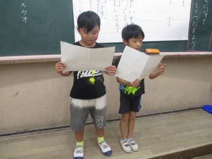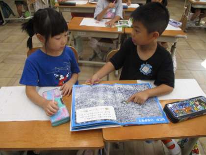 国語の学習「くじらぐも」の前には、「うみのかくれんぼ」を学習しました。かくれんぼチャンピオンは、はまぐり?もくずしょい?いやいや、たこ?などみんなで話し合いました。その後、もっとかくれんぼチャンピオンがいるかもしれないと、調べて発表しました!世の中には、かくれんぼが上手な生き物がいるものですよ。