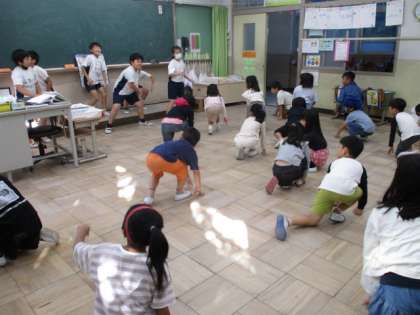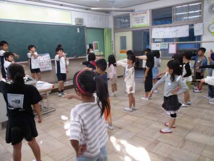 3年生が、1年生の教室に来て全校ダンスをかっこよく踊ってくれました。腕をしっかり伸ばしたり、指の先を見ること、足はぐっと曲げた方がいい!など、カッコよく踊れるコツを教えてくれました。そのアドバイスを聞いて、1年生のみんなも自分の踊りを確認しながら覚えていきました。ありがとう、3年生!!