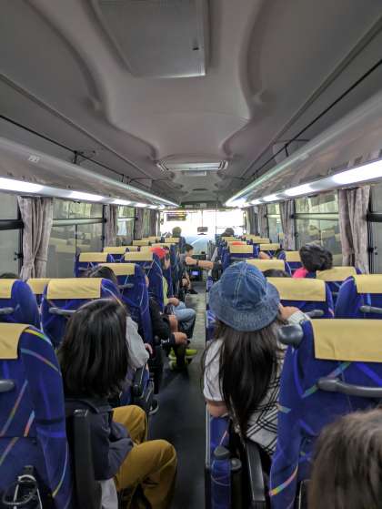 出発式を終え、元気にバスに乗り込みました。バスはセントレア空港に向けて高速道路を走っています。